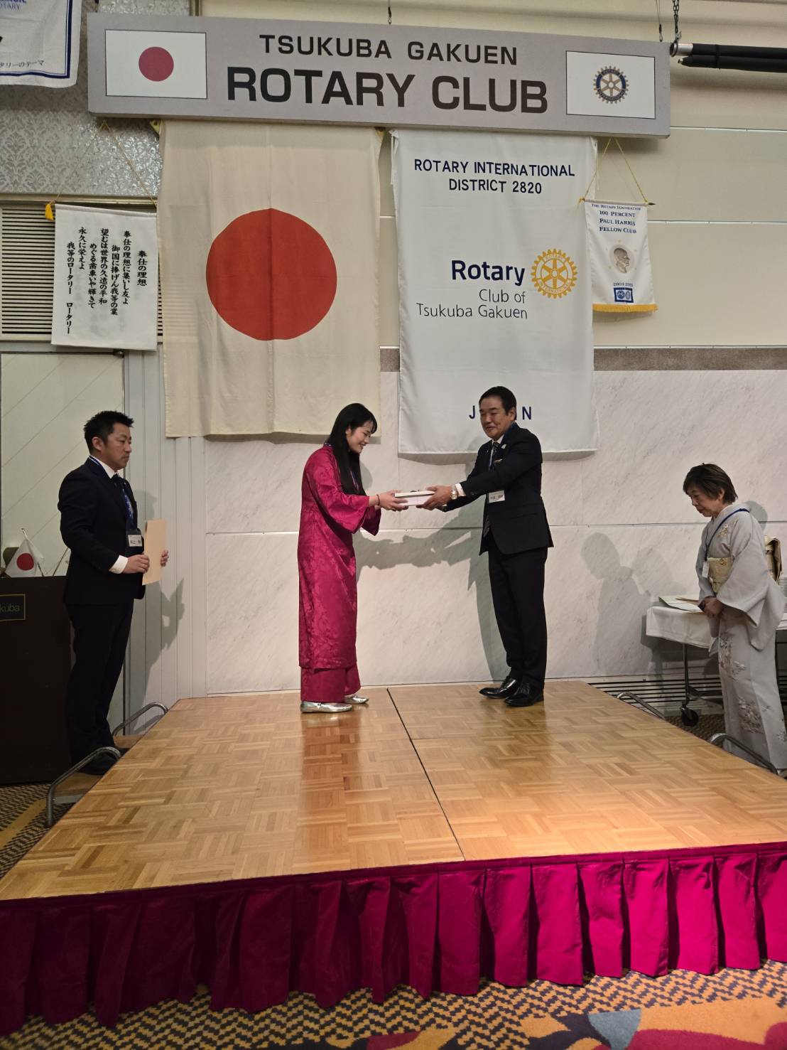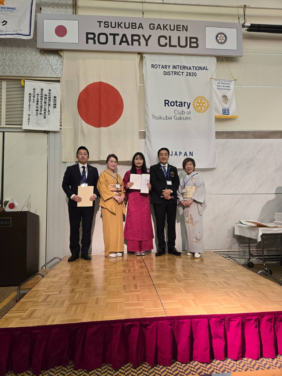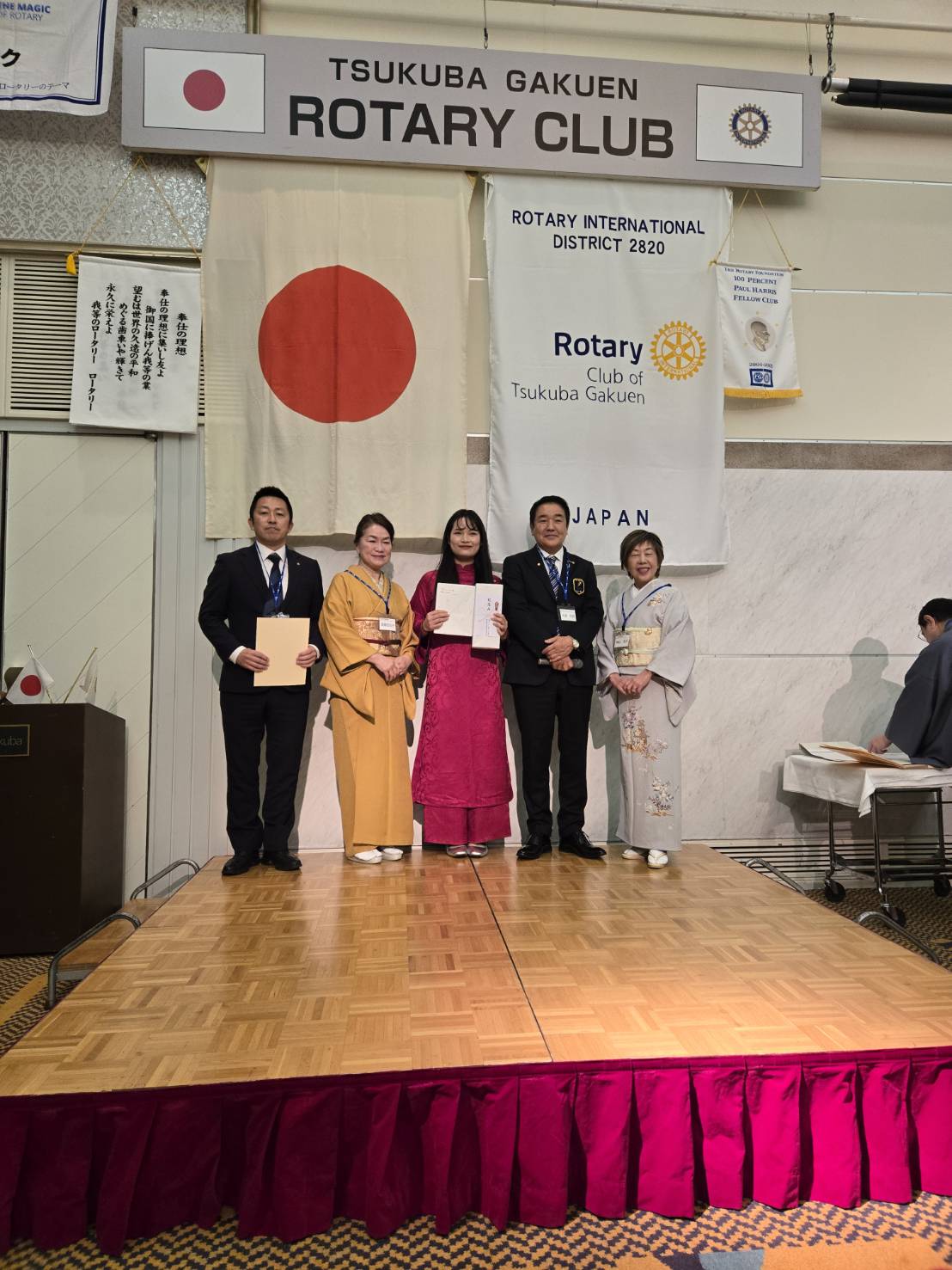 米山記念奨学会2024年度終了式がつくば市ホテル日航にて行われ、当クラブから斉藤百合子地区委員と井上勉と米山記念奨学会委員長、そしてベトナムからの奨学生グェン・ティ・ハインさんが出席しました。ハインさんの朱のアオザイが華やかに会場を彩っていました。斉藤地区委員、井上委員長大変お疲れさまでした。ハインさん、これからも古河ロータリークラブはハインさんを応援しています。益々のご活躍に期待しております!